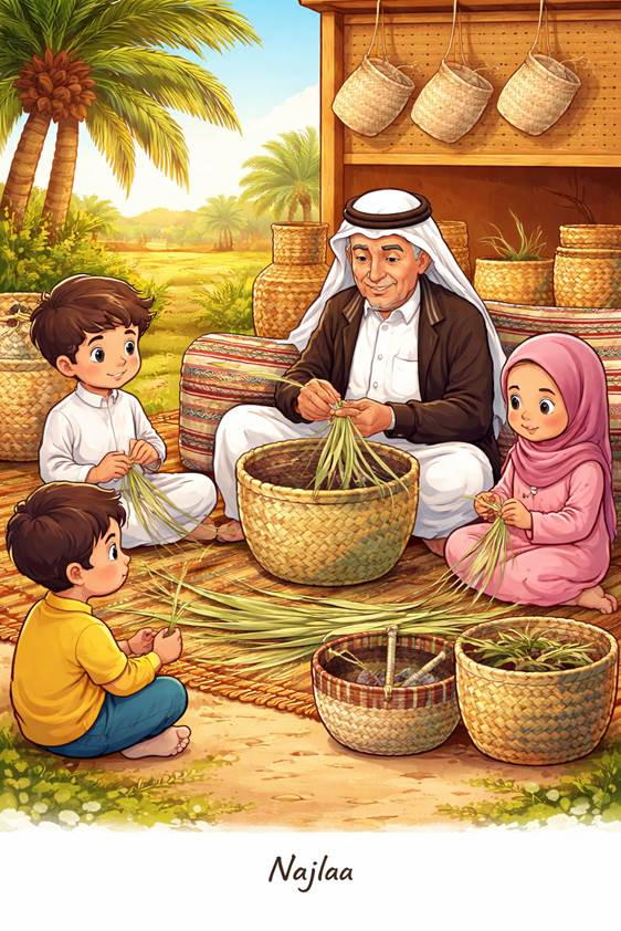 يجلسون على السجاد، يمسكون الخوص، ويستمعون لنصائح العم راشد وهو يقول لهم: “الخوص مثل الحياة… إذا شددته كثيرًا ينكسر، وإذا تركته مرتخيًا ما يتماسك.”