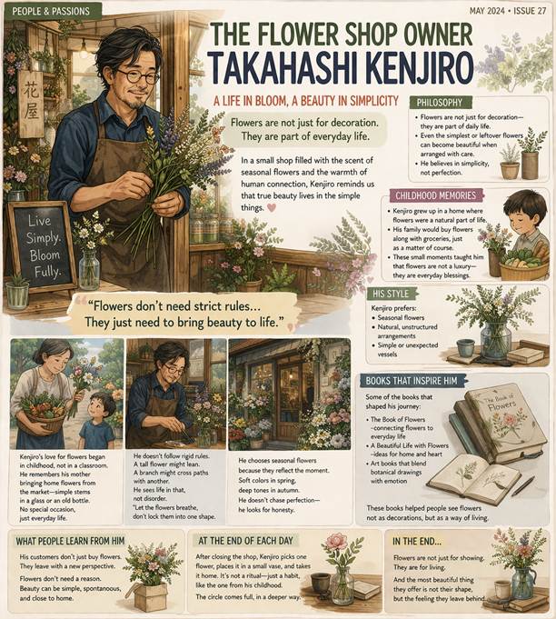 في نهاية كل يوم، وبعد أن يغلق متجره، كان تاكاهاشي يختار زهرة واحدة فقط، يضعها في وعاء صغير، ويأخذها معه إلى المنزل.